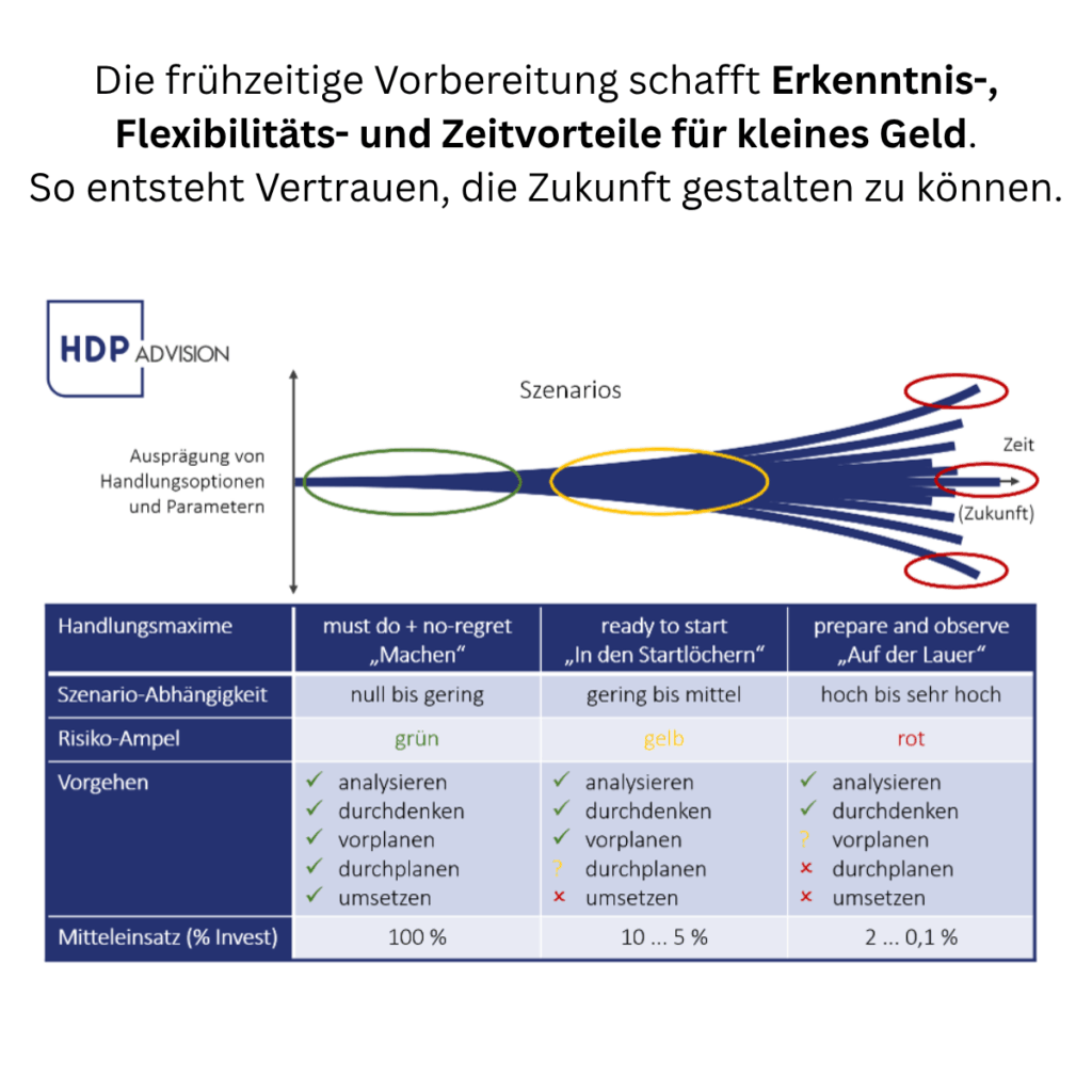 Die Szenario-Planung ist ein Beispiel dafür, dass die frühzeitige Befassung und Planung für wenig Einsatz große Vorteile bietet: